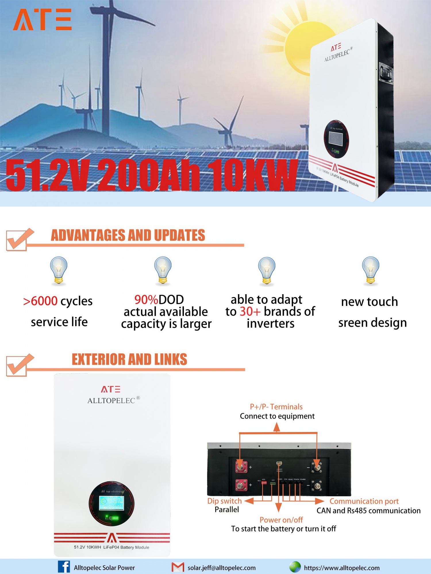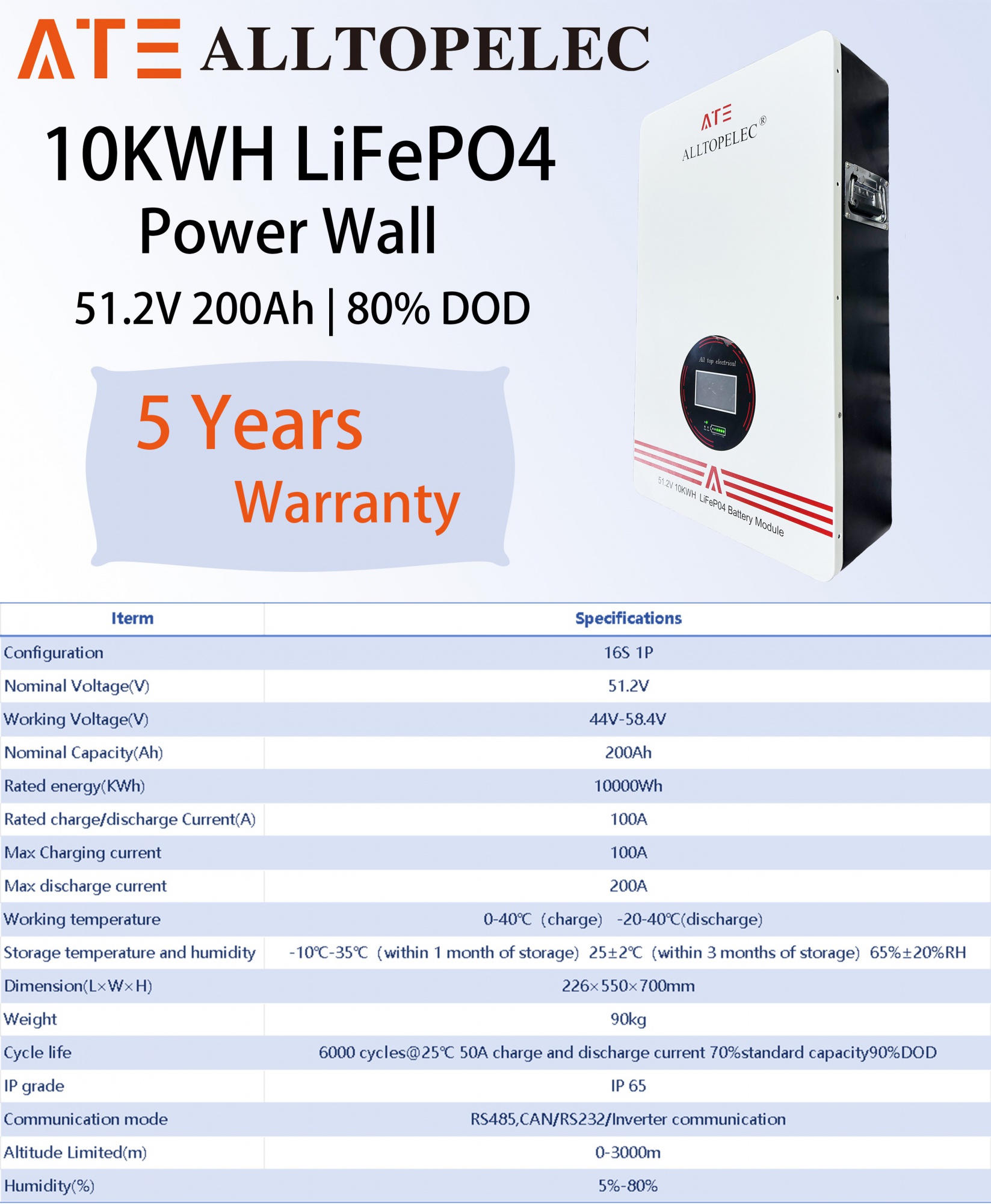 ATE 10kWh 51.2V 200Ah Deep Cycle Battery with Smart BMS
