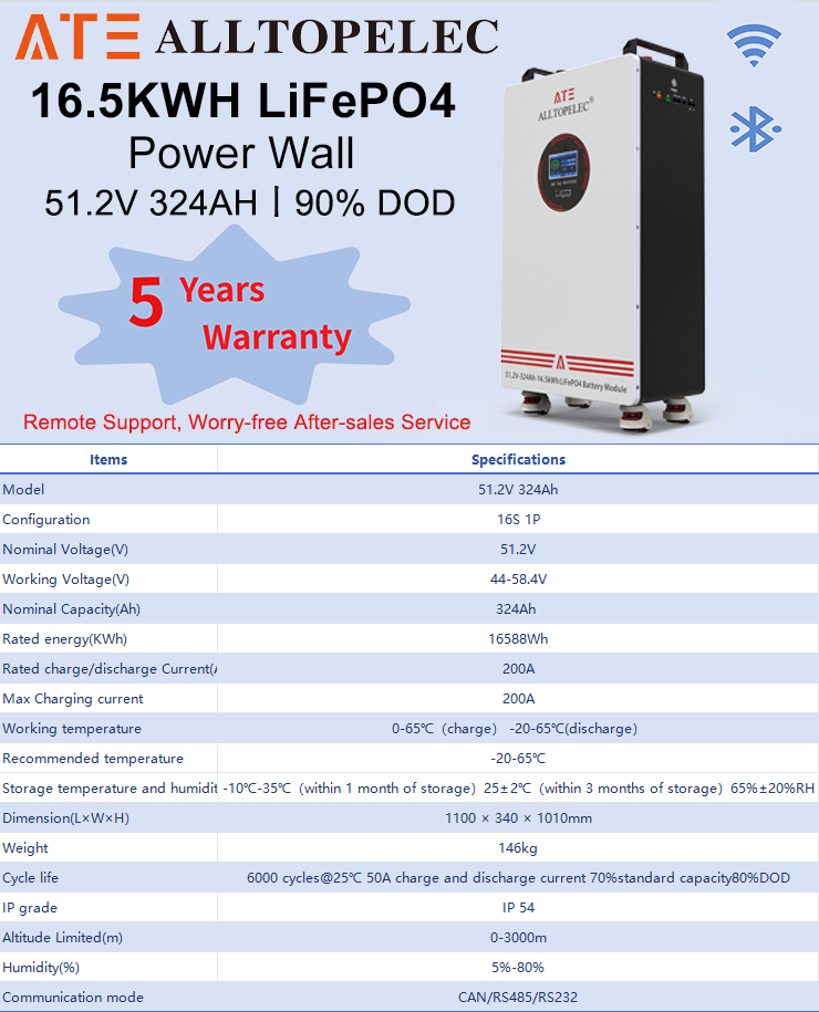 The ATE 51.2V 324Ah 16.5kWh Solar Storage Battery is a premium energy solution designed to meet the growing demand for reliable, high‑capacity power in homes, businesses, and off‑grid systems. Built with advanced lithium iron phosphate (LiFePO4) technology, this battery delivers exceptional safety, efficiency, and longevity, making it a trusted choice for modern renewable energy setups.