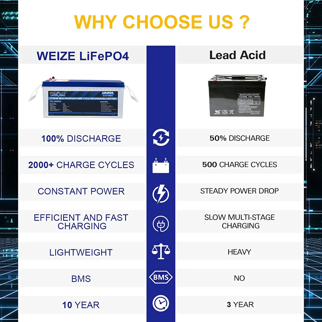 WEIZE 24V 200Ah 5120Wh LiFePO4 Lithium Battery